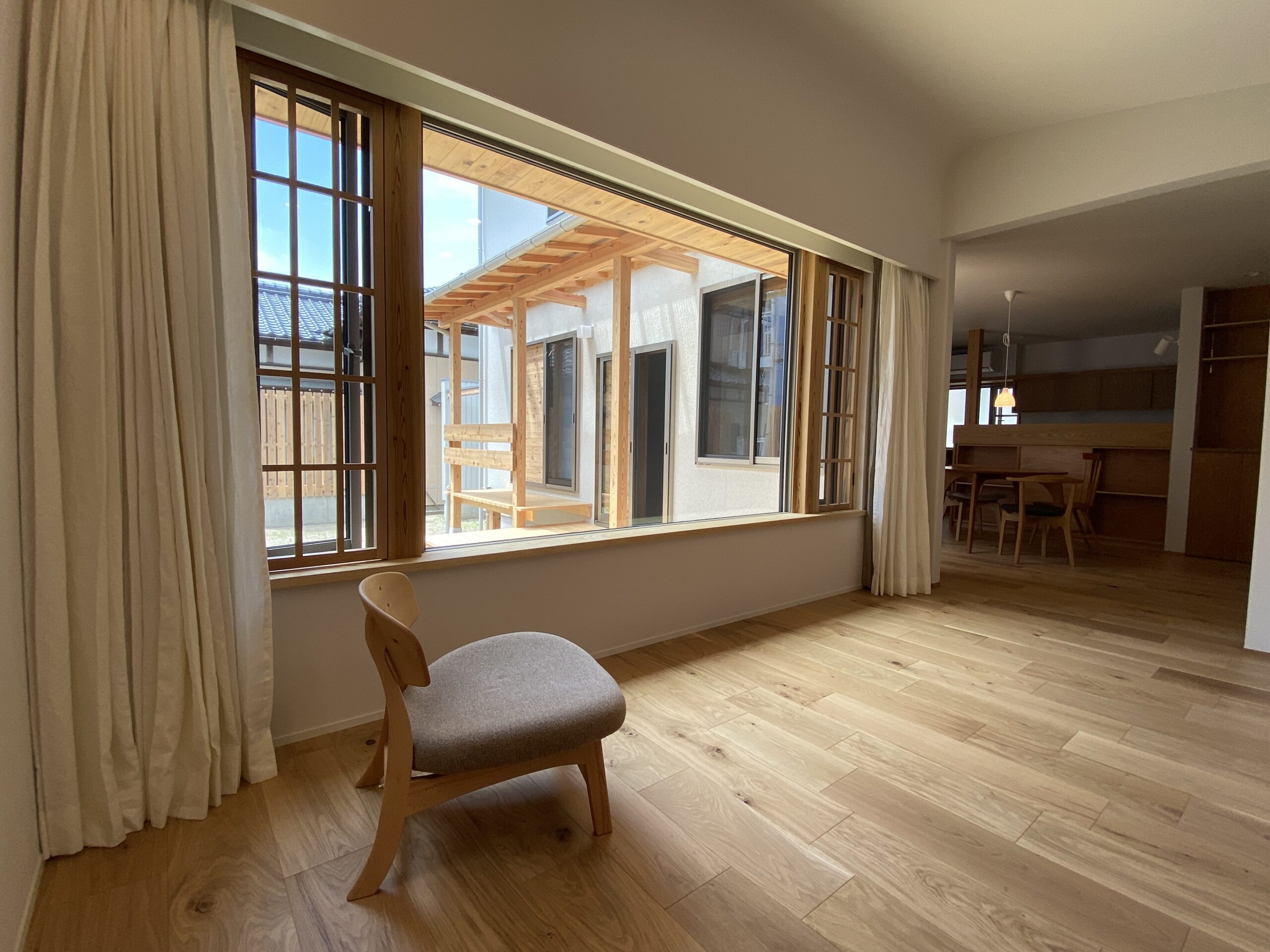 大開口のリビング窓に自然素材のカーテン