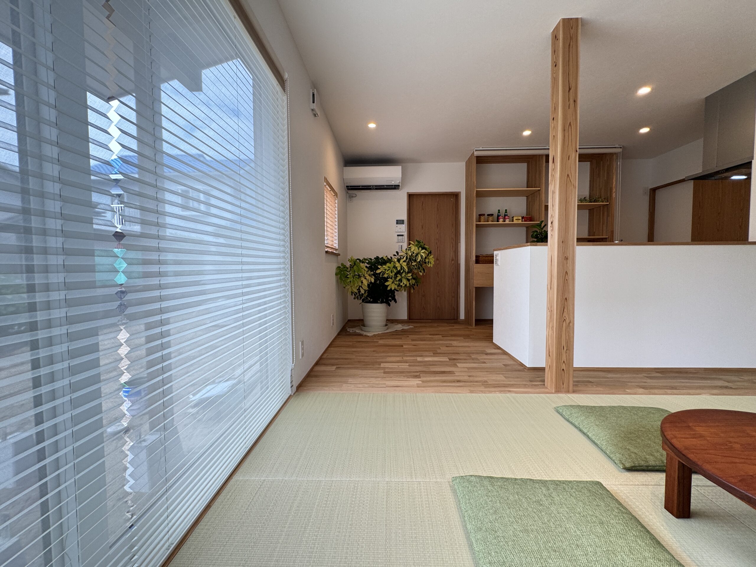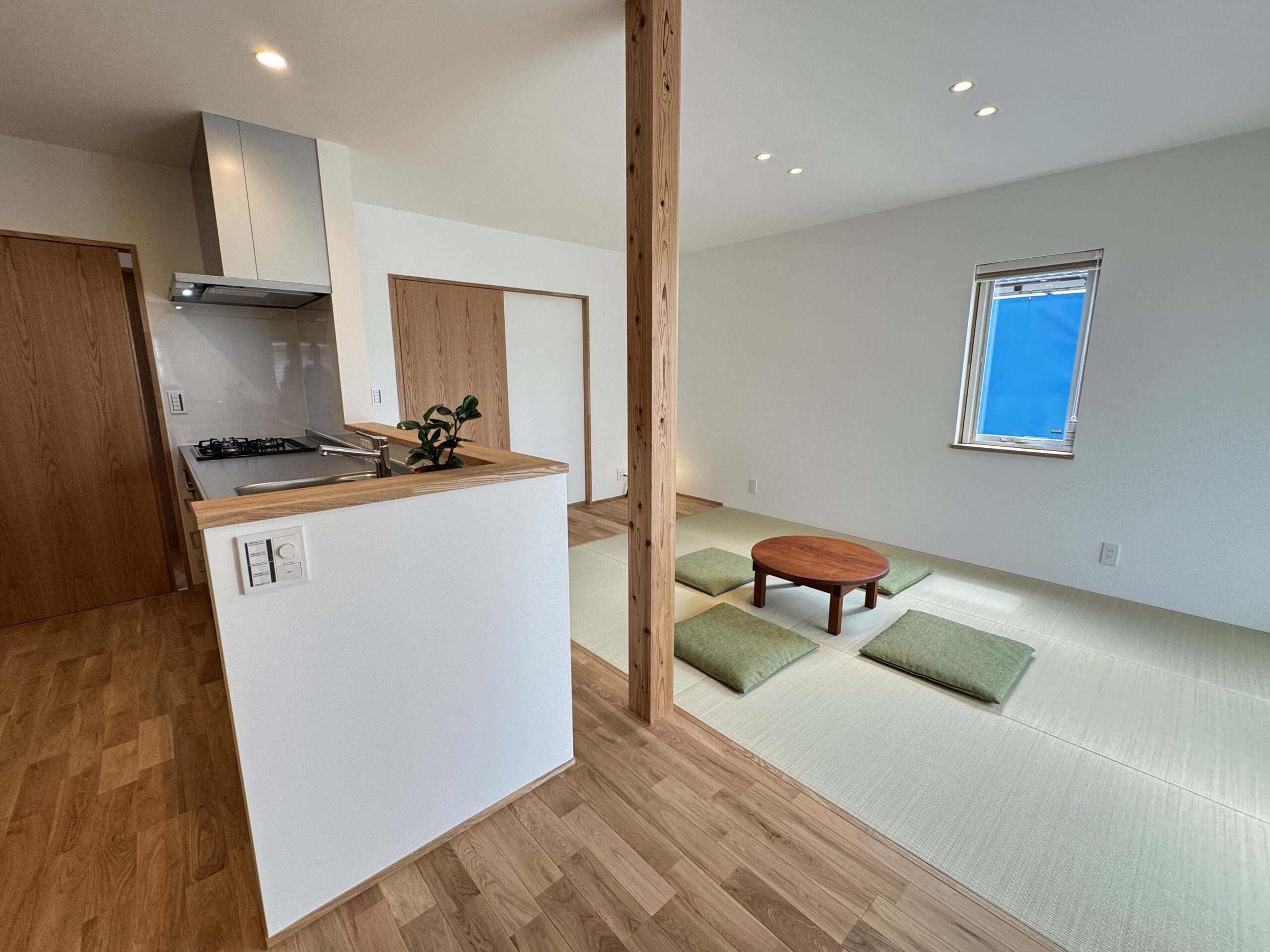 対面キッチンの先には、やさしいグリーンの畳リビング。