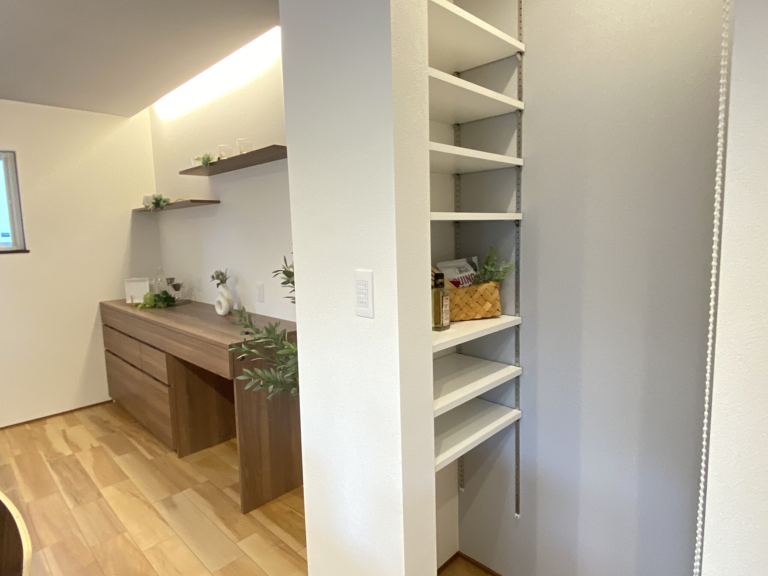 そのうえ、 キッチン横にはパントリーとカップボードがまとまってて、収納力もバッチリ。