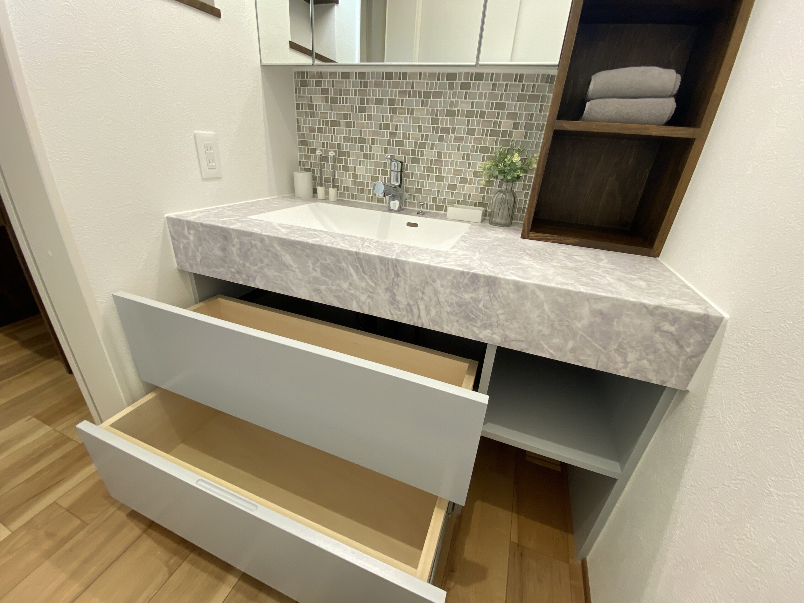 実はこのお家、 テレビボードやキッチンのカップボード、洗面台まで造作(オリジナルで作ってもらうこと)なの!