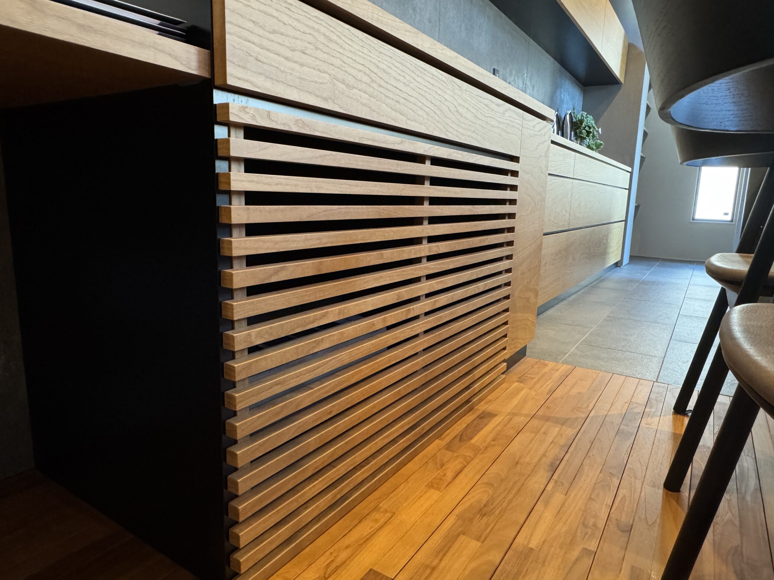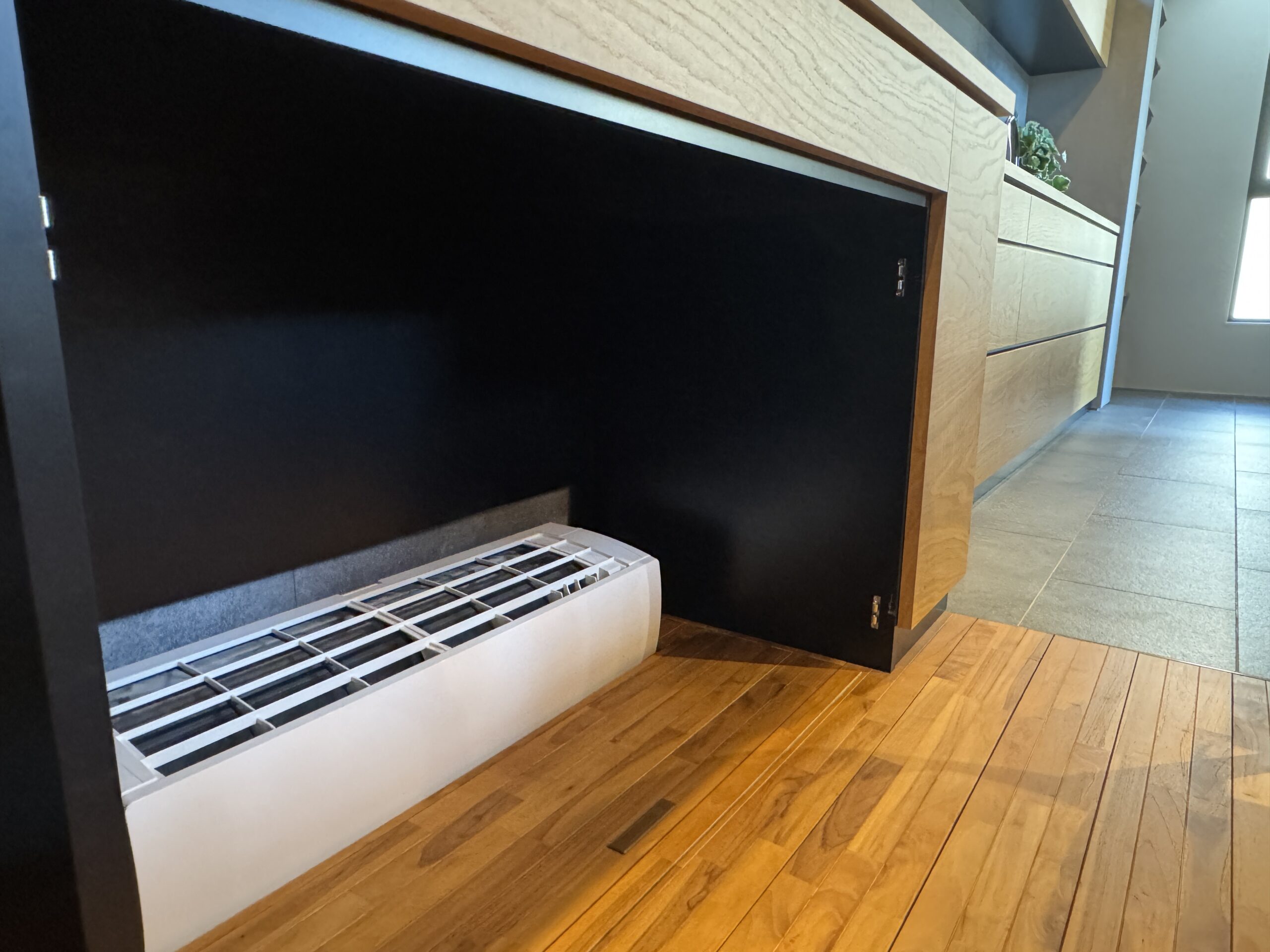 冬稼働するエアコンはキッチン背面収納のルーバーの中に隠れてた!床下エアコンってやつ。