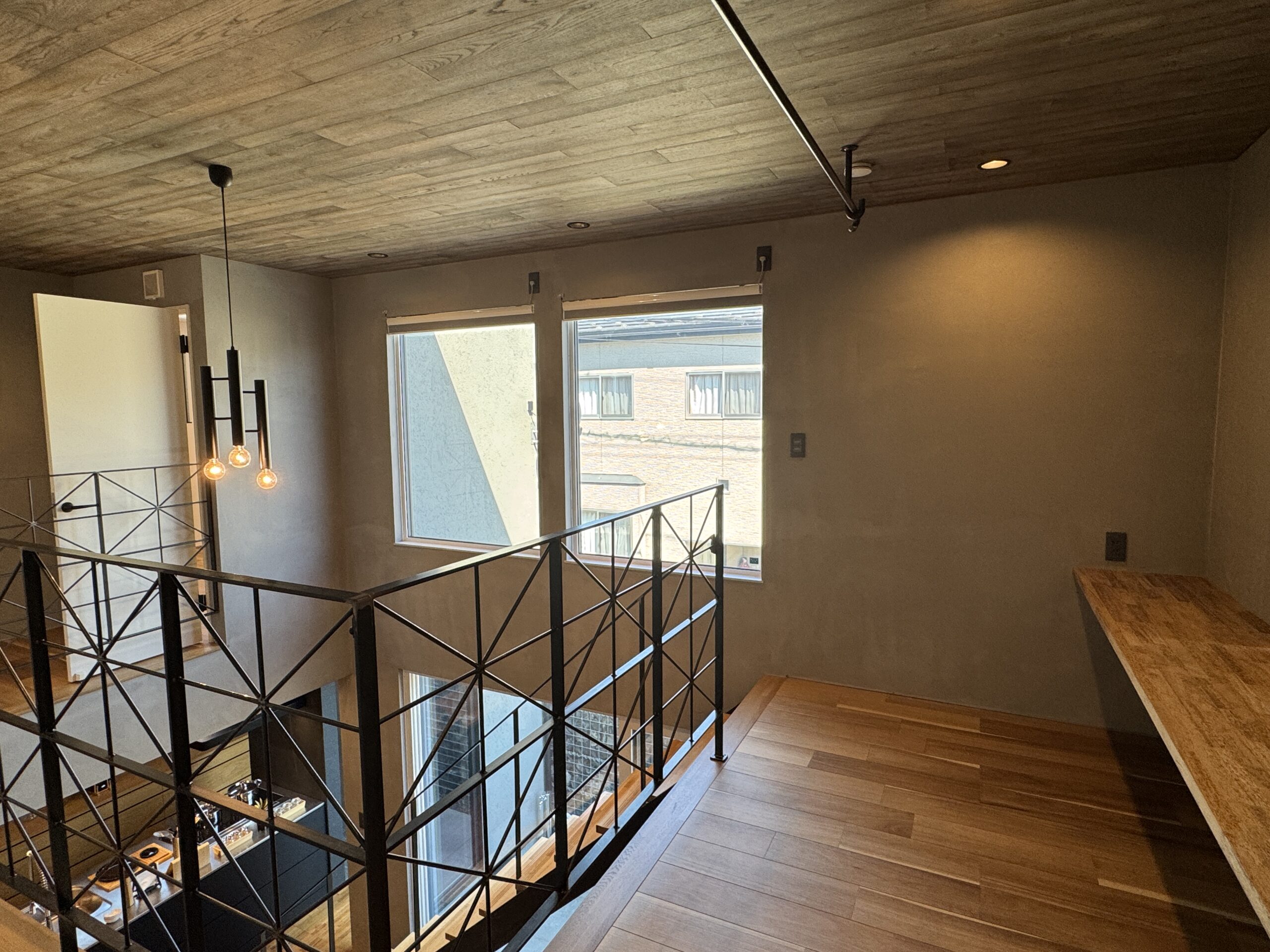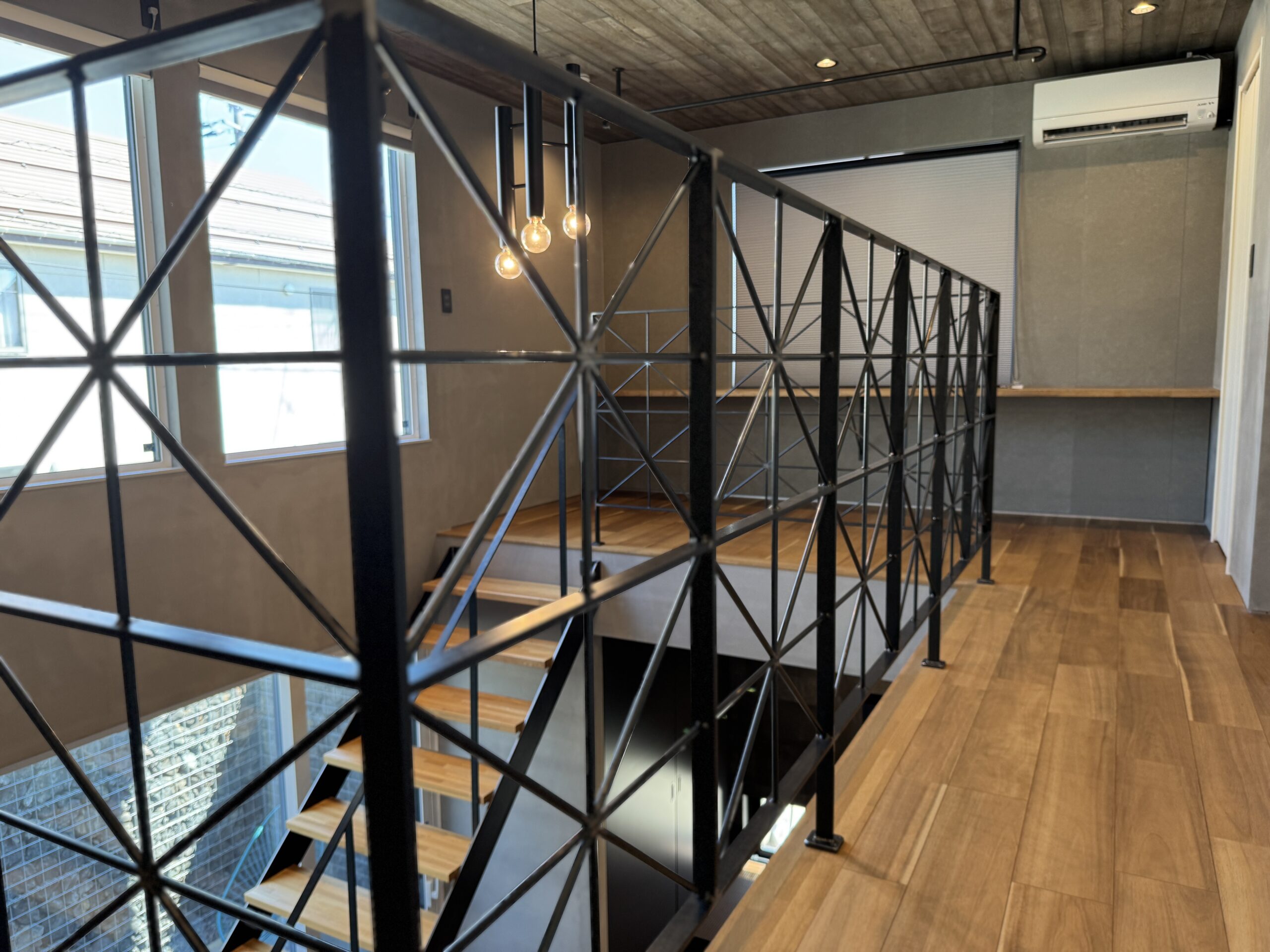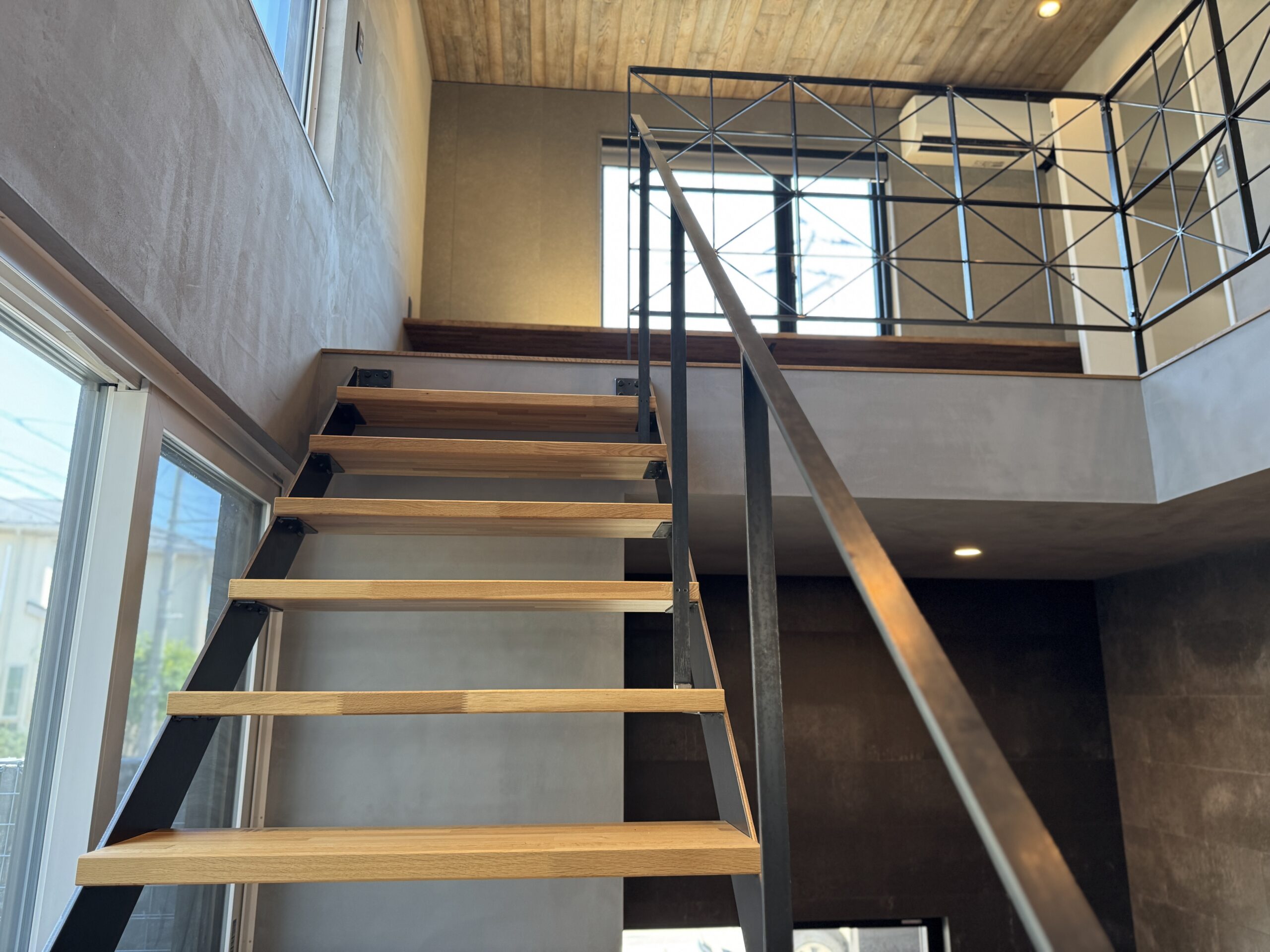 2階の階段の手すりが、バッテン模様の黒いアイアンですっごくオシャレなの!