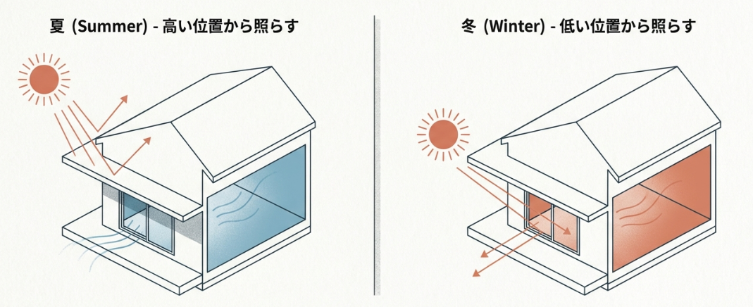 庇の真価は、実は冬にも発揮されます。 冬は太陽の角度が低いため、計算された庇なら日差しを邪魔せず、窓からたっぷり熱を家の中に入れてくれます。