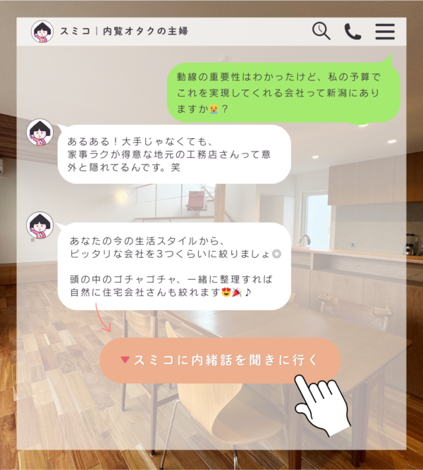 営業マンには聞きづらい「ぶっちゃけ、あの会社の断熱ってどう?」というリアルな評判や、予算オーバーを防ぐためのコツ、スミコがLINEでこっそり教えます!
